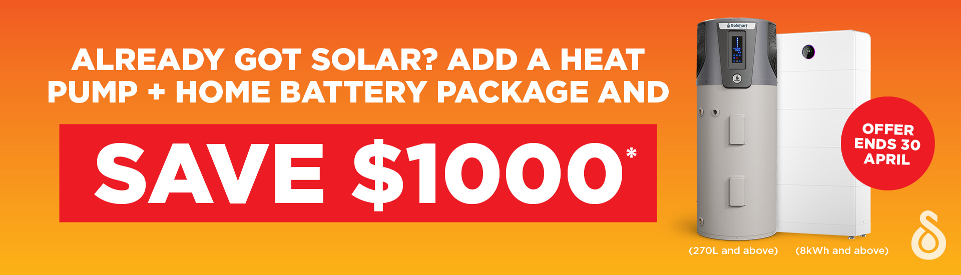 *$1,000 point of sale discount applies to the purchase of a package deal that includes an eligible Solahart Heat Pump (270L litres and above) together with a Home Battery (8kWh and above) in one transaction. Offer available from 10/03/2026 until 30/04/2026. Excludes commercial installations and Tesla Batteries. Not available in conjunction with any other offer.
